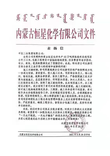 9月29日,內(nèi)蒙古恒星化學有限公司發(fā)來表揚信,對中國二冶及達旗項目部精心組織、精準實施表示由衷感謝,對統(tǒng)籌各種資源、落實工期節(jié)點、嚴格按照施工技術(shù)步驟與措施施工給予高度贊揚。