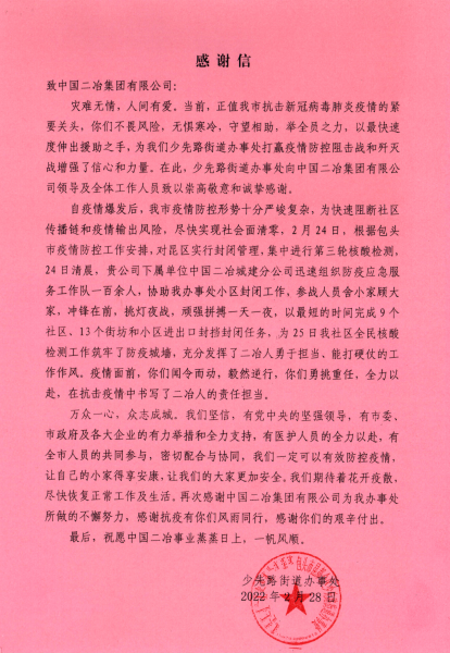 感謝信中寫道,在這場無硝煙的戰斗中,在全市上下萬眾一心、眾志成城抗擊新冠肺炎疫情的關鍵時刻,中國二冶城建分公司發揚“雷厲風行,使命必達”的企業作風,第一時間趕赴昆區少先路街道辦事處,協助對所管轄的9個社區、13個街坊和小區迅速展開封擋封閉施工。參戰人員舍小家顧大家,沖鋒在前,挑燈夜戰,頑強拼搏一天一夜,以最短的時間全面完成封閉任務,為社區全民核酸檢測工作筑牢了防疫城墻,充分發揮了二冶人勇于擔當、能打硬仗的工作作風。疫情面前,你們聞令而動,毅然逆行,你們勇挑重任,全力以赴,在抗擊疫情中書寫了二冶人的責任擔當。再次感謝中國二冶集團城建分公司的干部職工,用一腔忠誠和熱血,用骨子里的澎湃激情凝聚成打贏這場疫情阻擊戰的強大合力! 風雨無阻向前進,危難之際顯身手。