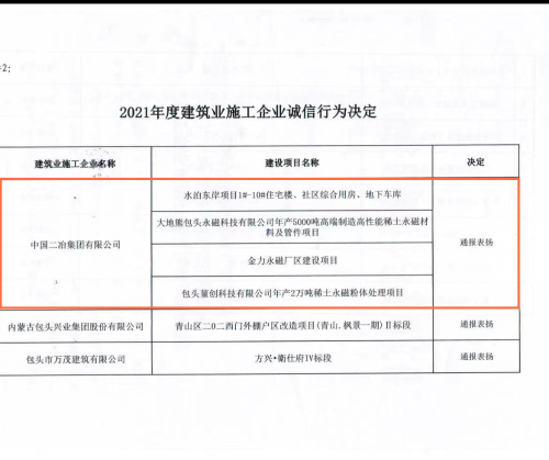 4月17日,中國二冶收到包頭市住房和城鄉建設局發布的《包頭市住房和城鄉建設局關于對2021年度全市建筑業施工企業誠信行為考核情況的通報》,對中國二冶在建筑市場的誠信行為予以表揚。