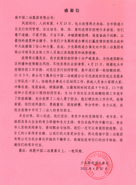 4月27日,包頭市昆區(qū)少先路街道辦事處致中國(guó)二冶感謝信,表?yè)P(yáng)中國(guó)二冶在這場(chǎng)急、難、險(xiǎn)、重的疫情防控硬任務(wù)面前,毫不退縮,不畏不懼、不言不棄,沖破困難阻礙,連夜奮戰(zhàn)不間斷,以最快的速度伸出援手,近一百名職工沖鋒到社區(qū)疫情封控一線(xiàn),全力配合昆區(qū)政府順利完成任務(wù)。特向中國(guó)二冶干部職工致以崇高敬意和衷心感謝!
