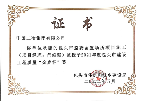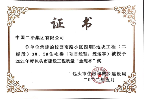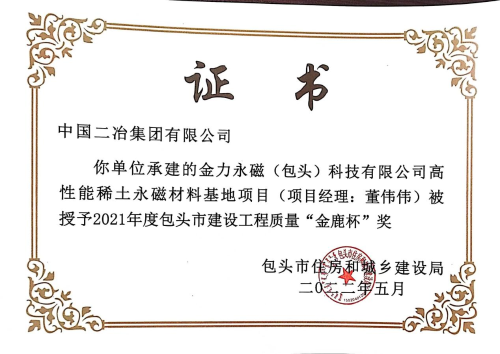 6月1日,中國二冶收到包頭市建筑業(yè)協(xié)會頒發(fā)的榮譽證書,中國二冶金力永磁 (包頭)科技有限公司高性能稀土永磁材料基地、包頭市監(jiān)委留置場所、校園南路小區(qū)四期B地塊工程(二標段)3#、5#住宅樓三項工程喜獲2021年度包頭市“金鹿杯”工程質(zhì)量獎。