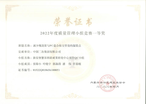 近年來,中國二冶始終長期堅持走高技術(shù)高質(zhì)量創(chuàng)新發(fā)展之路,自上而下成立質(zhì)量管理QC小組,加大科技創(chuàng)新力度,不斷鼓勵科研人員廣泛開展群眾性QC成果活動,加強工程實體質(zhì)量,打造精品工程,取得了突出成績。其中,中國二冶城建分公司淮安智慧谷科研成果轉(zhuǎn)化中心項目QC小組編寫的《減少現(xiàn)澆梁與PC疊合板交界處的漏漿點》、鋼結(jié)構(gòu)分公司QC小組編寫的《提高箱型柱對接焊縫一次焊接合格率》兩項QC成果榮獲內(nèi)蒙古自治區(qū)2022年度質(zhì)量管理小組競賽一等獎。