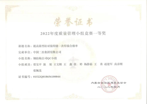 近日,中國二冶從內(nèi)蒙古自治區(qū)建筑業(yè)協(xié)會捧回獲獎證書,十八個項目斬獲內(nèi)蒙古自治區(qū)2022年度質(zhì)量管理小組競賽一、二、三等獎。