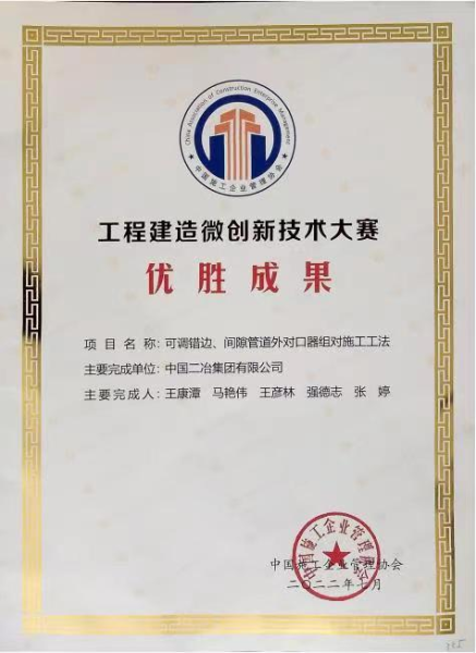 7月29日-30日,由中國施工企業(yè)管理協(xié)會主辦的2022年工程建設(shè)行業(yè)科技工作會議暨科技成果競賽交流會在杭州召開。會上,由中國二冶選送的“可調(diào)錯邊、間隙管道外對口器組對施工工法”榮獲第二屆工程建造微創(chuàng)新技術(shù)大賽優(yōu)勝成果獎;“大口徑長輸管道大跨度整體吊裝施工方法”榮獲第二屆工程建設(shè)行業(yè)高推廣價值專利大賽三等獎。