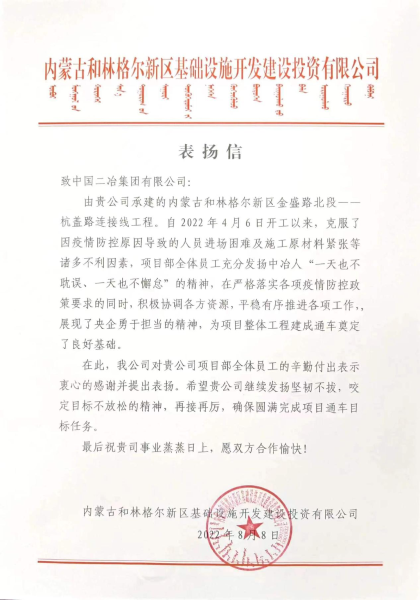8月8日,內蒙古和林格爾新區基礎設施開發建設投資有限公司向中國二冶發來表揚信,對中國二冶項目建設團隊專業水平表示肯定,對內蒙古和林格爾新區金盛路北段--杭蓋路連接線工程施工建設進程表示高度贊揚。