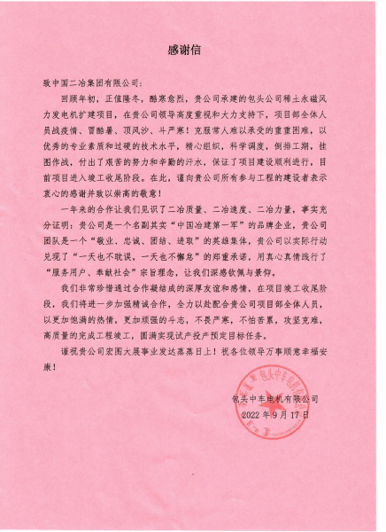 9月26日,包頭中車電機有限公司向中國二冶致表揚信,表揚中國二冶戰(zhàn)疫情、冒酷暑、頂風沙、斗嚴寒,克服重重苦難,保證項目建設順利進行的央企作為,對中國二冶承建的包頭中車項目順利完成各項工程節(jié)點和任務目標表示認可。