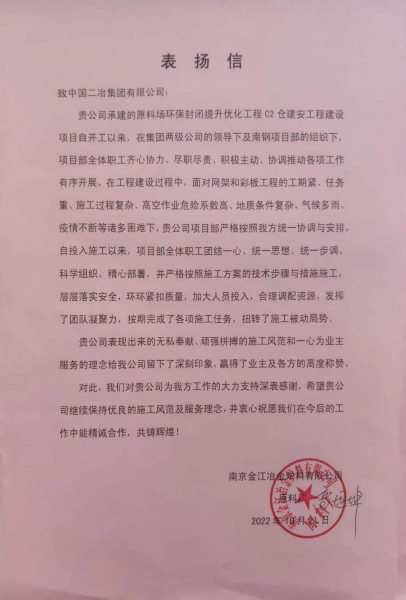 10月21日,中國二冶南鋼項目部收到來自業主單位南京金江冶金爐料有限公司原料廠的表揚信,對中國二冶冶金分公司南鋼項目部在承建的原料廠環保封閉提升優化工程C2倉建安工程項目建設過程中講信譽、重合同、保履約給予表揚,同時對項目部的嚴格管理以及優秀的工作態度表示贊賞。
