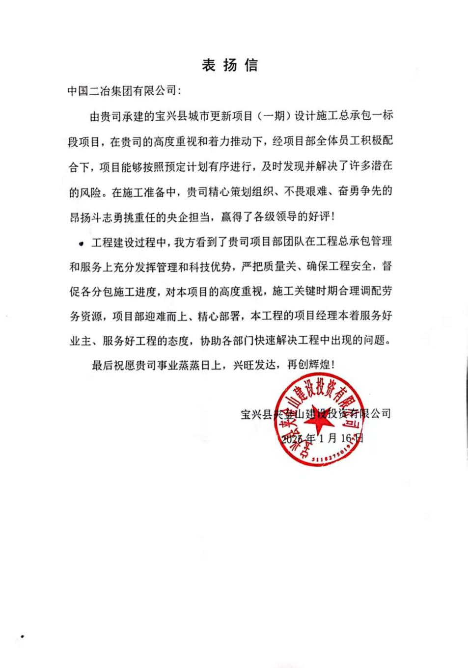 此次收到表揚信,不僅是對寶興縣城市更新項目管理團隊各項工作成果的肯定,更是對項目后續施工建設的鞭策和激勵。下一步,項目管理團隊將全面加強施工現場安全質量管控,以強有力的舉措,高標準完成后續施工任務,為寶興縣高質量發展貢獻二冶力量。