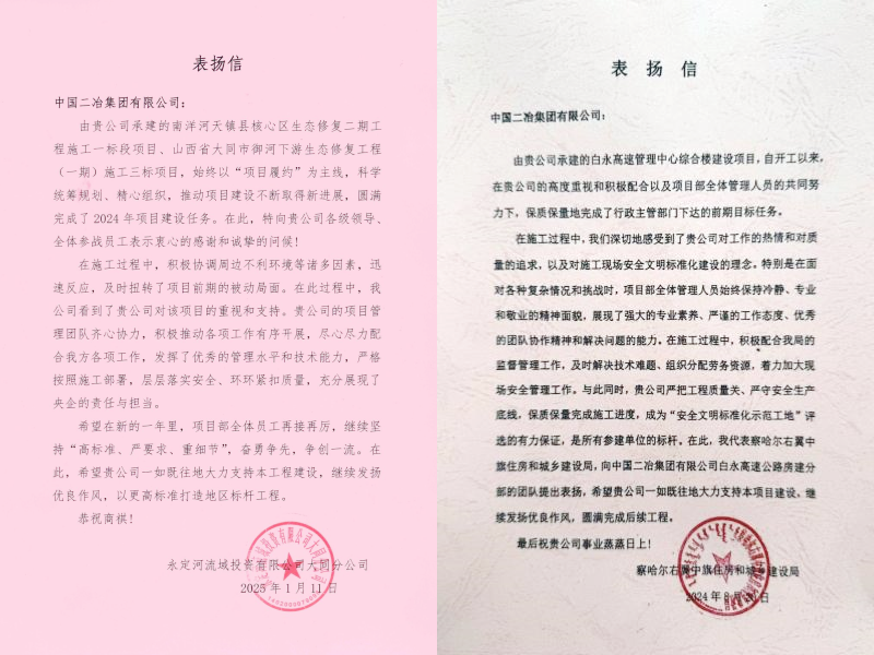 兩封表揚(yáng)信真摯誠懇、情真意切,是對(duì)中國二冶高質(zhì)量施工管理和匠心鑄造精品工程的一致認(rèn)可。下一步,中國二冶將繼續(xù)發(fā)揚(yáng)“彰顯央企擔(dān)當(dāng),鑄就永恒精品”的企業(yè)使命,圓滿完成后續(xù)各項(xiàng)工作任務(wù),確保項(xiàng)目高質(zhì)量完美履約,為公司與業(yè)主交上一份滿意答卷。