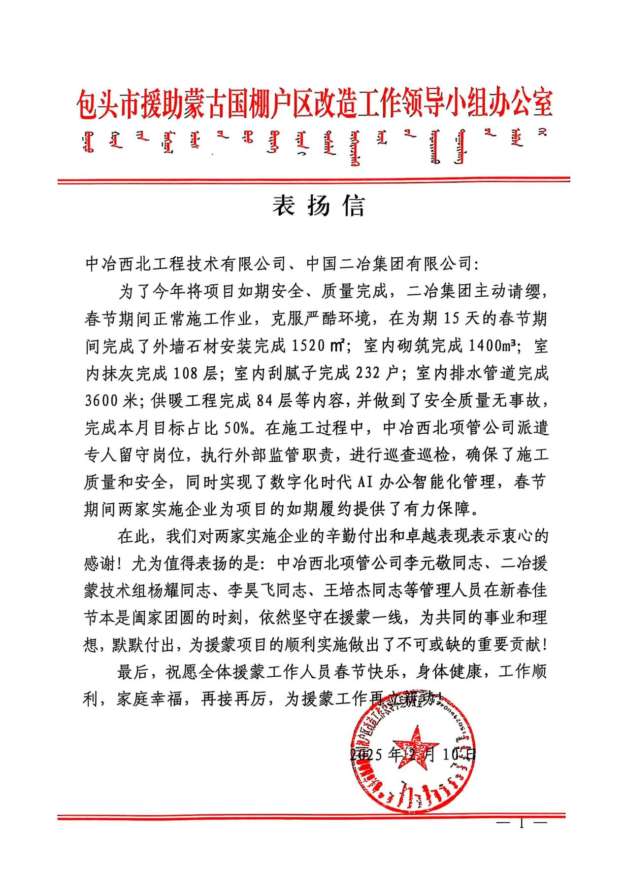 信中指出,為了今年項(xiàng)目保質(zhì)保量,如期竣工交付,中國(guó)二冶主動(dòng)請(qǐng)纓,春節(jié)期間克服嚴(yán)酷環(huán)境,正常施工作業(yè)不打烊,在短短的15天節(jié)日里完成外墻石材1520㎡、室內(nèi)砌筑1400m3、室內(nèi)抹灰108層、室內(nèi)刮膩?zhàn)?32戶、室內(nèi)排水管道3600米、供暖工程84層等施工內(nèi)容,并做到了安全質(zhì)量無事故,完成本月網(wǎng)絡(luò)節(jié)點(diǎn)目標(biāo)占比50%,全面實(shí)現(xiàn)履約目標(biāo),充分彰顯了中國(guó)央企的硬核實(shí)力和責(zé)任擔(dān)當(dāng)。