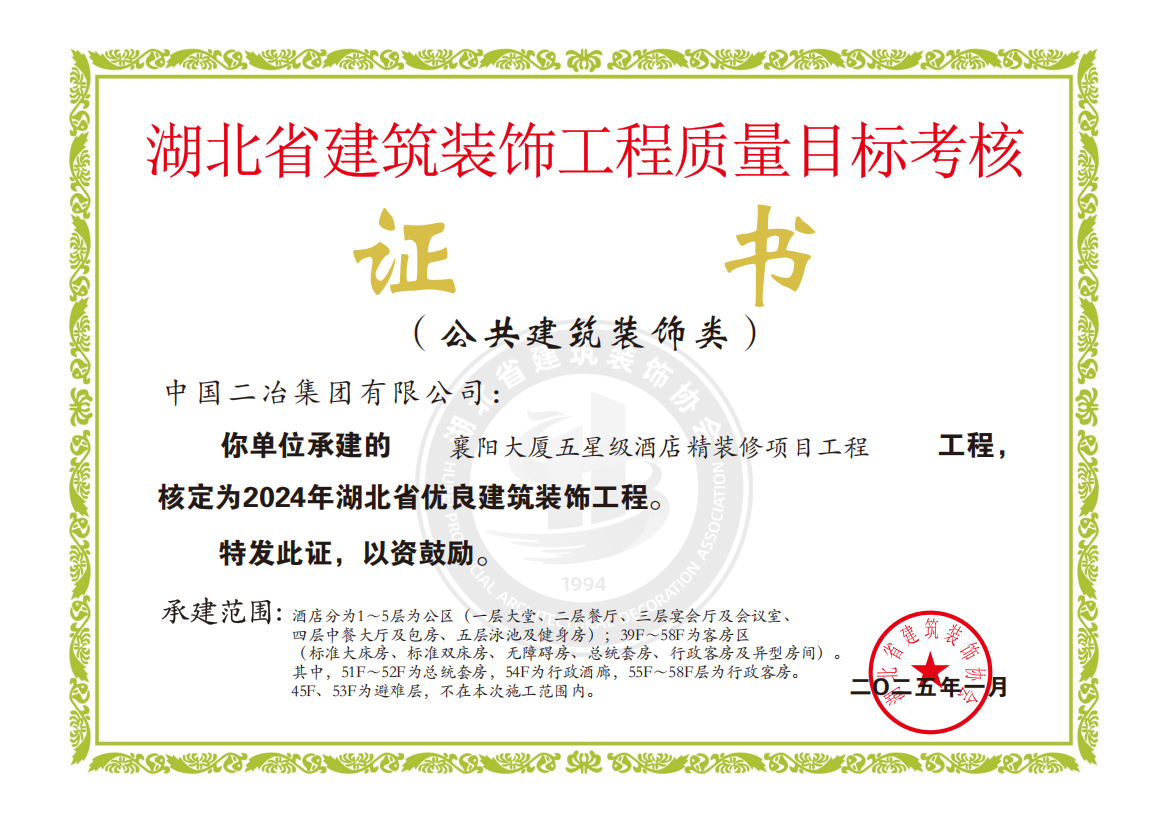 近日,湖北省建筑裝飾協(xié)會(huì)發(fā)布2024年度“湖北省優(yōu)良建筑裝飾工程”評(píng)選結(jié)果,中國(guó)二冶襄陽(yáng)大廈五星級(jí)酒店精裝修項(xiàng)目榮獲2024年“湖北省優(yōu)良建筑裝飾工程”。
