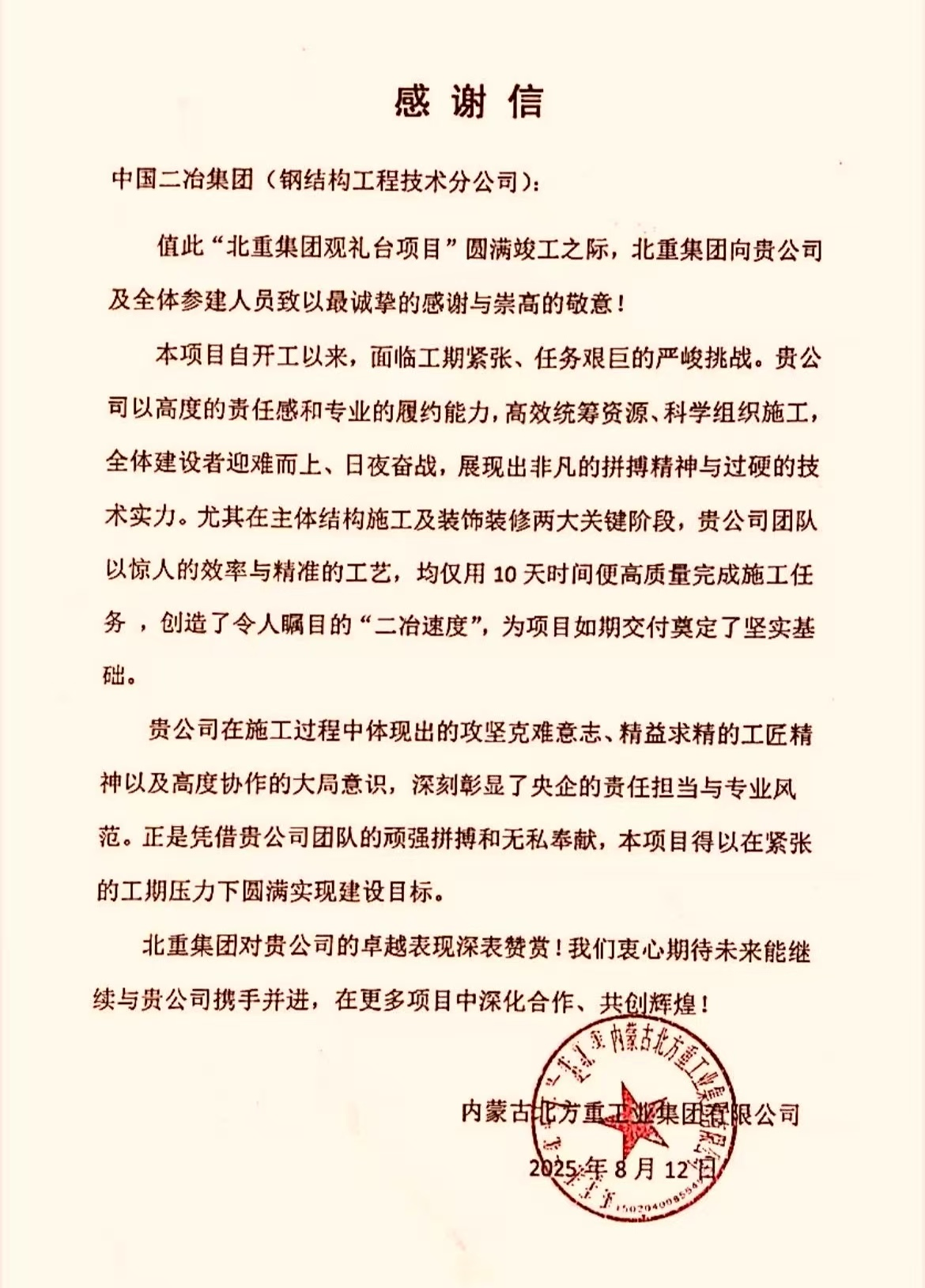 信中最后,內(nèi)蒙古北方重工業(yè)集團(tuán)有限公司再次對(duì)中國二冶及項(xiàng)目部全體人員對(duì)項(xiàng)目的辛勤付出表示真誠的感謝,并期待未來與中國二冶攜手并進(jìn),共創(chuàng)輝煌!