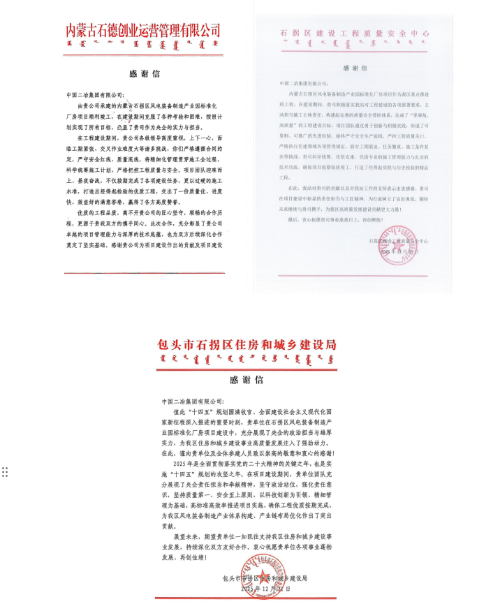 12月31日,中國二冶連續收到包頭市石拐區住房和城鄉建設局、石拐區建設工程質量安全中心、內蒙古石德創業運營管理有限公司發來的感謝信。信中對中國二冶項目管理團隊在項目建設中的辛勤付出與突出貢獻給予高度贊揚。