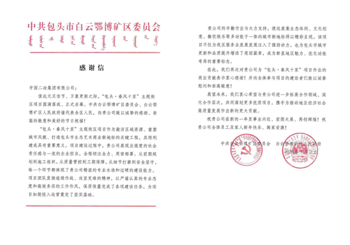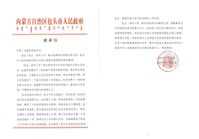 此次感謝及表揚(yáng),既是對(duì)中國(guó)二冶建設(shè)成果的高度認(rèn)可,也是對(duì)團(tuán)隊(duì)付出的充分信賴。未來,中國(guó)二冶將以此為激勵(lì),持續(xù)深耕包頭城市建設(shè)領(lǐng)域,以更多優(yōu)質(zhì)精品工程賦能地方發(fā)展,為推動(dòng)地區(qū)經(jīng)濟(jì)社會(huì)高質(zhì)量發(fā)展貢獻(xiàn)更大央企力量。