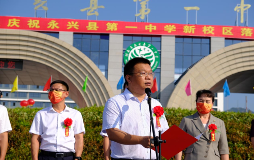 揭牌儀式首先由永興一中校長(zhǎng)胡兆文致辭。他指出,永興一中項(xiàng)目建設(shè)是造福當(dāng)?shù)匕傩盏囊豁?xiàng)重大民生工程,是功在當(dāng)代,利在千秋的一件大事。他希望學(xué)生們心懷天下做有家國(guó)情懷的人,意志堅(jiān)韌做積極進(jìn)取的人,心胸開闊做陽光大度的人,心存善意做助人為樂的人。最后,他祝學(xué)生們?cè)谛碌膶W(xué)校快樂成長(zhǎng)。