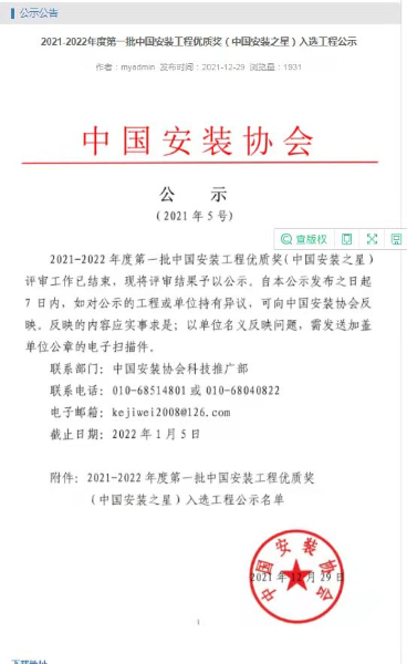 12月29日,中國安裝協會公布了2021--2022年度第一批中國安裝工程優質獎(中國安裝之星)獎。中國二冶內蒙古達拉特旗90萬噸/年鋁板帶項目獲得(中國安裝之星)獎。